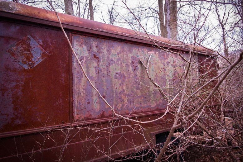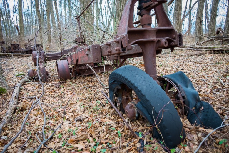 On one side of this clearing in the woods (looking East) where all these relics reside is a deep ravine; so they didn’t come from that direction. Looking West is where the railroad ran and now the trail. It looks like there was a path, probably a dirt farm road at one time. Many of the New Jersey roads we drive over started out as Indian paths, then farm roads, and now they’re paved roads. There was probably a dirt railroad crossing at the point where the path leads into the clearing. All of this stuff was likely kept in garages and barns on the other side of the tracks where Levitt (developer William Levitt) built a subdivision, probably in the mid-to late 1960’s. After the farm was sold, its buildings were demolished and with nowhere else to put the tractors, trucks and tillers they just drove everything to this clearing and left it. And here it still sits, within sight of the bedroom community windows that displaced it.