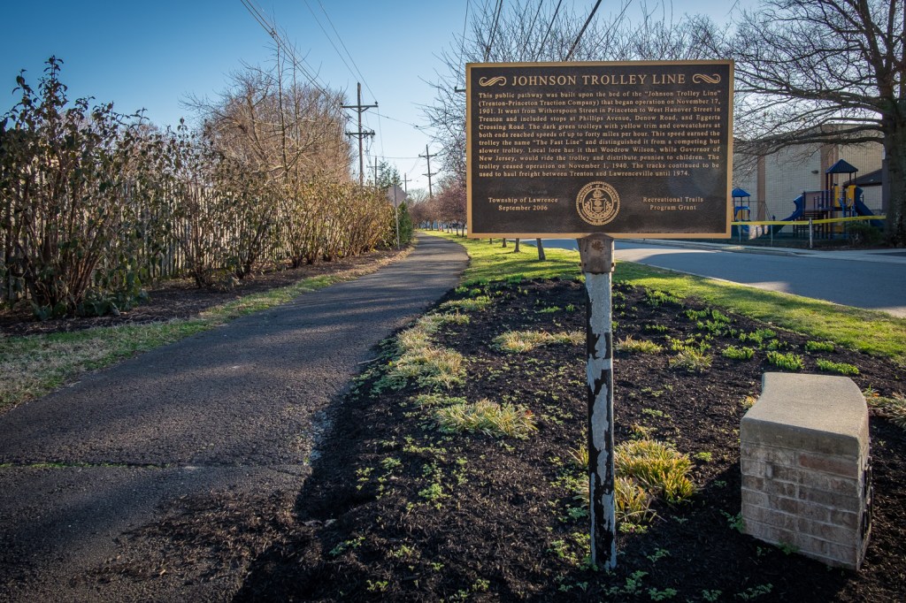 The railroad that ran here was operated by the Trenton-Princeton Traction Company and featured an electric-powered, double-ended green and yellow trolley. It cost 10 cents to ride and purportedly reached speeds of up to 40 miles per hour, hence the nickname, “Fast Line.” That’s pretty fast for a train that began operations in 1901. The same company ran another Fast Line trolley from Trenton to New Brunswick, of which a short 2-1/2 mile section is now the Trolley Line Trail in nearby West Windsor. The trolley company ceased service in 1940.